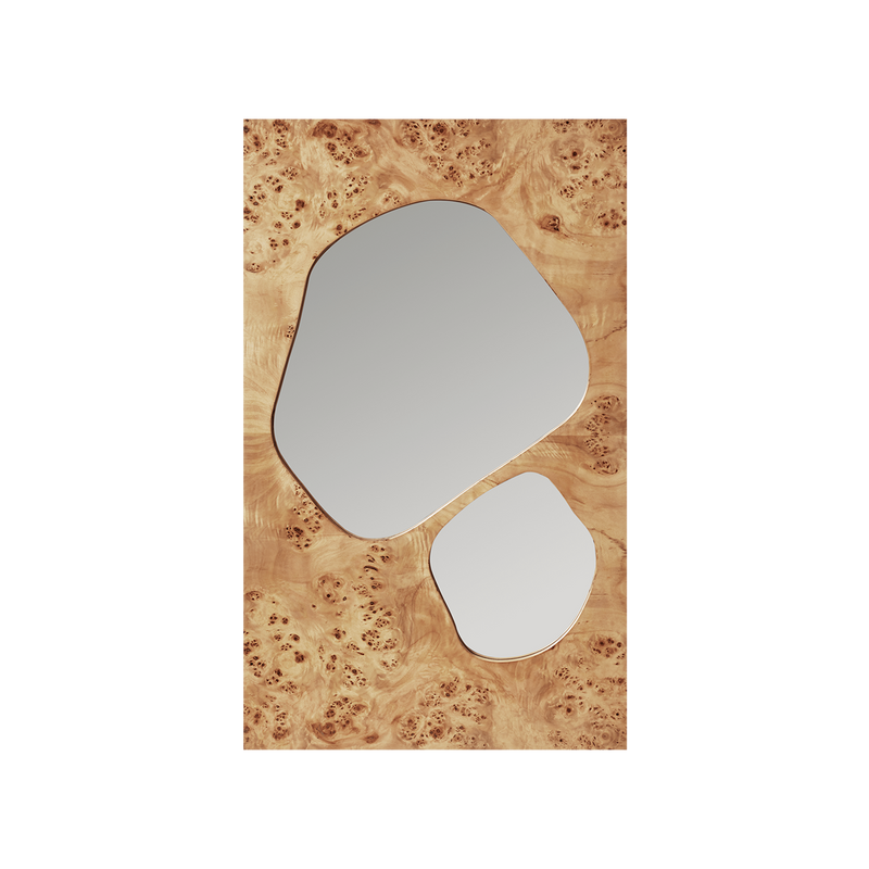 Elaborado en chapa de raíz de álamo teñida con certificación FSC™ Mix, cada espejo es único gracias a los matices y vetas singulares de la madera. Las incrustaciones asimétricas en el cristal evocan el movimiento de las hojas, generando un equilibrio entre artesanía, diseño contemporáneo y naturaleza.