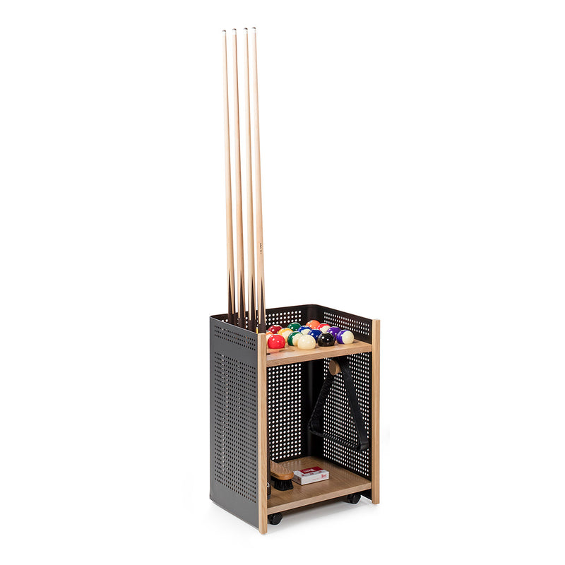 El Carrito para Tacos Mou de RS Barcelona es el complemento indispensable para quienes disfrutan del billar con orden, estilo y funcionalidad. Diseñado para acompañar la mesa Diagonal, este carrito reúne todos los accesorios del juego —tacos, bolas, triángulo, tizas y pequeños objetos personales— en un único espacio elegante y bien organizado, evitando improvisaciones y manteniendo siempre todo a mano.