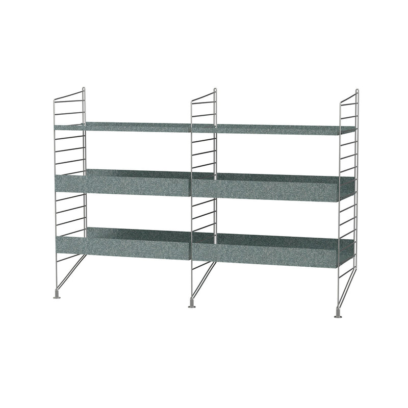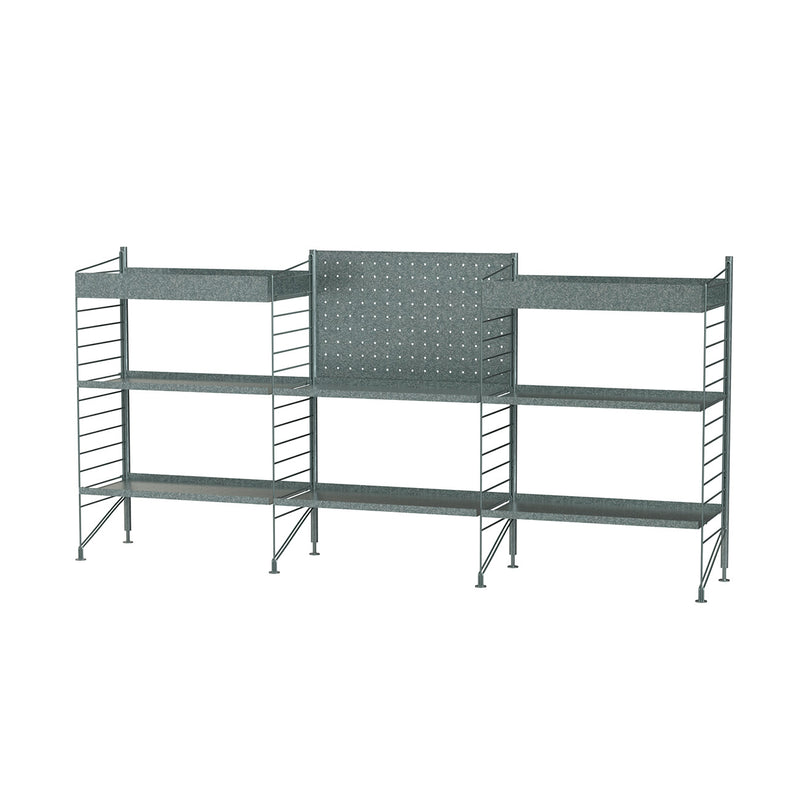 Estantería galvanizada autoportante para uso en exteriores. Esta combinación de tres secciones más grande resulta perfecta para balcones o patios de mayor superficie. La combinación de estantes metálicos galvanizados con bordes altos y bajos confiere carácter a la estantería y le permite más posibilidades de almacenamiento. El material galvanizado cambia con el tiempo y deja una bonita pátina.