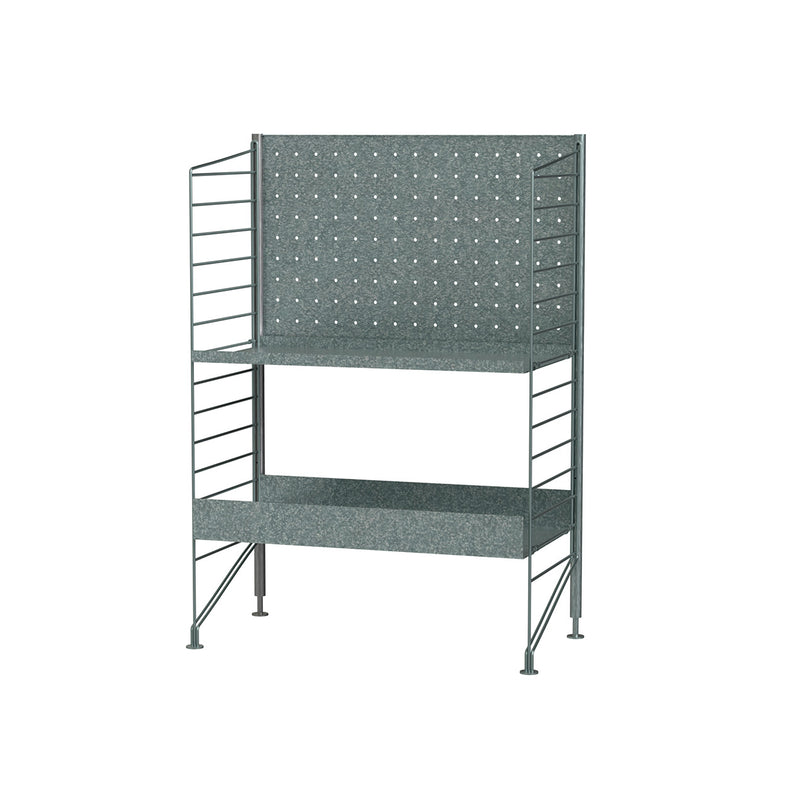 Esta combinación de dos secciones montada en suelo se ha diseñado para uso al aire libre. La superficie de los paneles y los estantes galvanizados cambia con el tiempo ofreciendo una bonita pátina. La combinación de estantes de borde alto y bajo aporta carácter a la unidad.