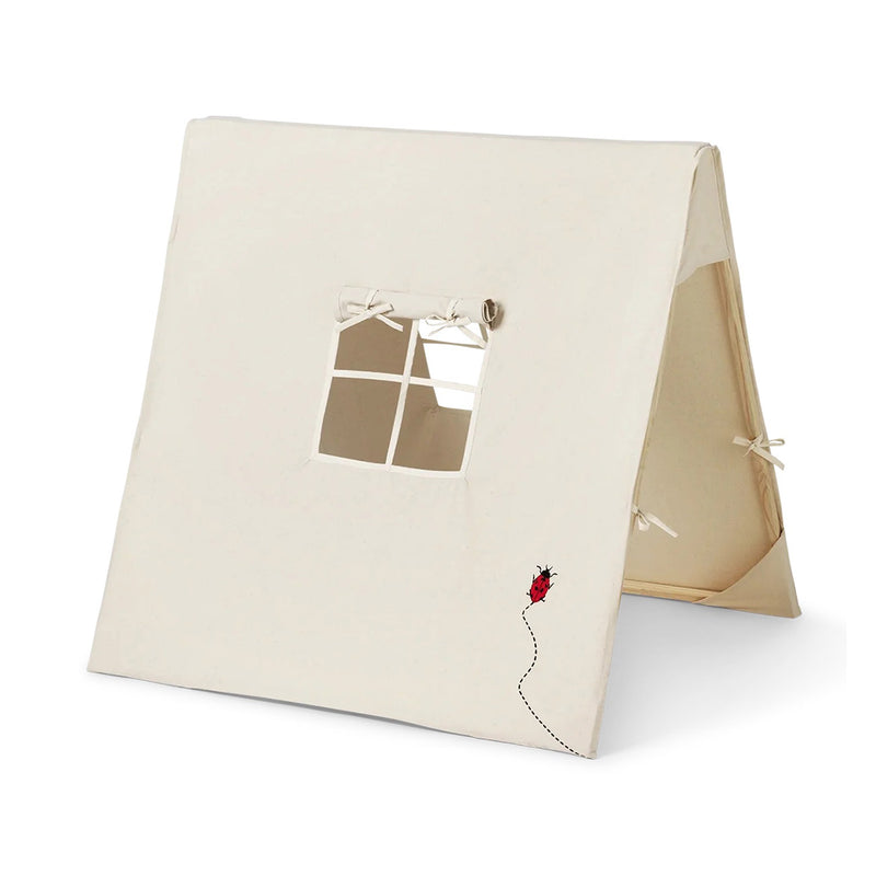 La Tienda infantil Ladybird de Ferm Living Kids crea un rincón mágico donde los niños pueden jugar, leer o descansar bajo una atmósfera acogedora. Confeccionada en algodón natural con bordados de mariquita, se sostiene sobre una estructura de madera que aporta estabilidad y calidez visual.