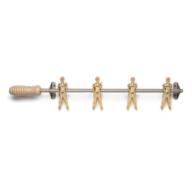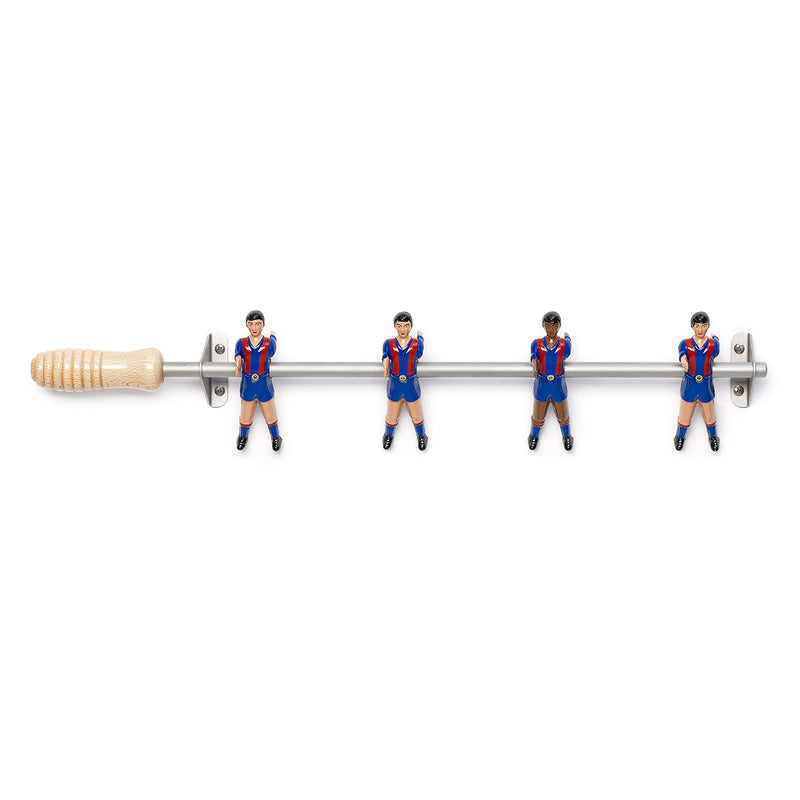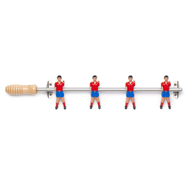 El Perchero Champions LaLiga de RS Barcelona convierte la pasión futbolera en diseño contemporáneo. Inspirado en los icónicos jugadores del futbolín, este colgador de pared traslada a tu hogar una pieza tan nostálgica como actual. Una barra con cuatro jugadores pintados a mano, rematada con el clásico mango de madera, recrea la estética inconfundible de un futbolín “arrancado” del campo de juego.