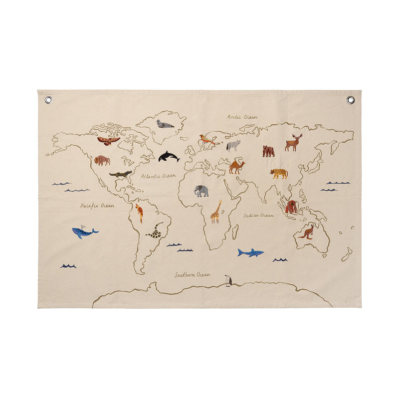 El Mapa textil The World de Ferm Living Kids convierte la pared en una ventana al planeta. Esta pieza decorativa y educativa invita a los más pequeños a descubrir el mundo y sus animales mientras aprenden jugando.