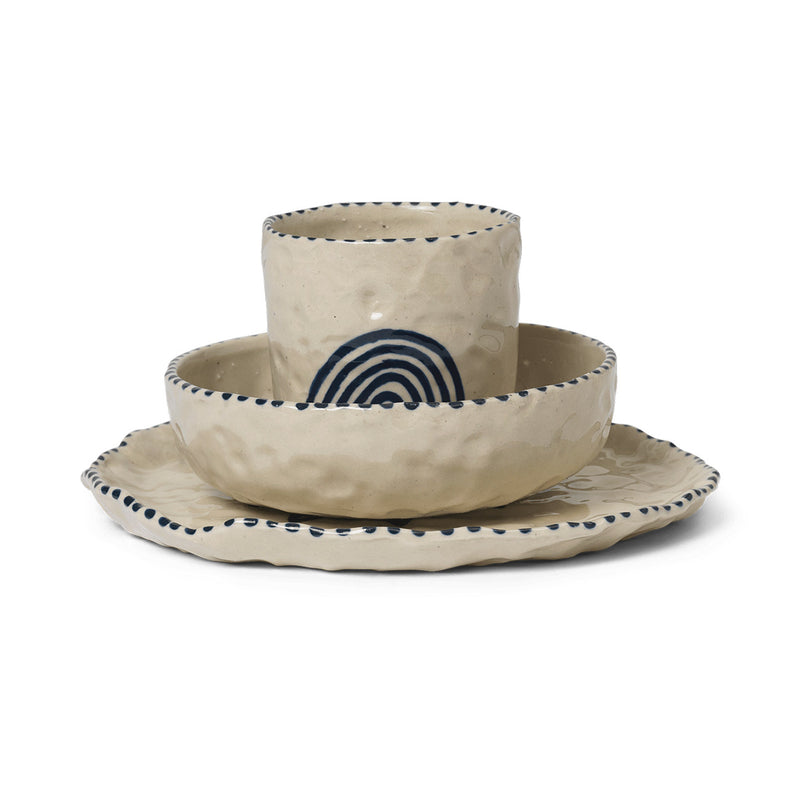El Set de cerámica Naive de Ferm Living celebra la belleza de la imperfección y el valor del trabajo artesanal. Cada pieza muestra motivos pintados a mano e improntas instintivas que capturan la huella de su creador, transformando el objeto cotidiano en una pequeña obra de arte única.
