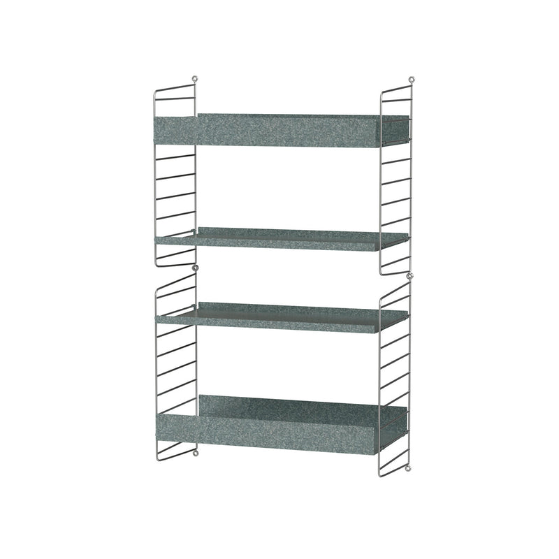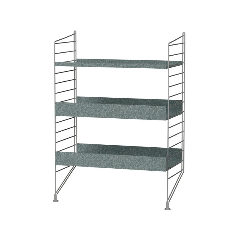 This floor-mounted combination section is designed for outdoor use. Featuring galvanized panels and shelves, the surface changes over time, leaving a beautiful patina. A combination of high- and low-edged shelves adds character to the unit.