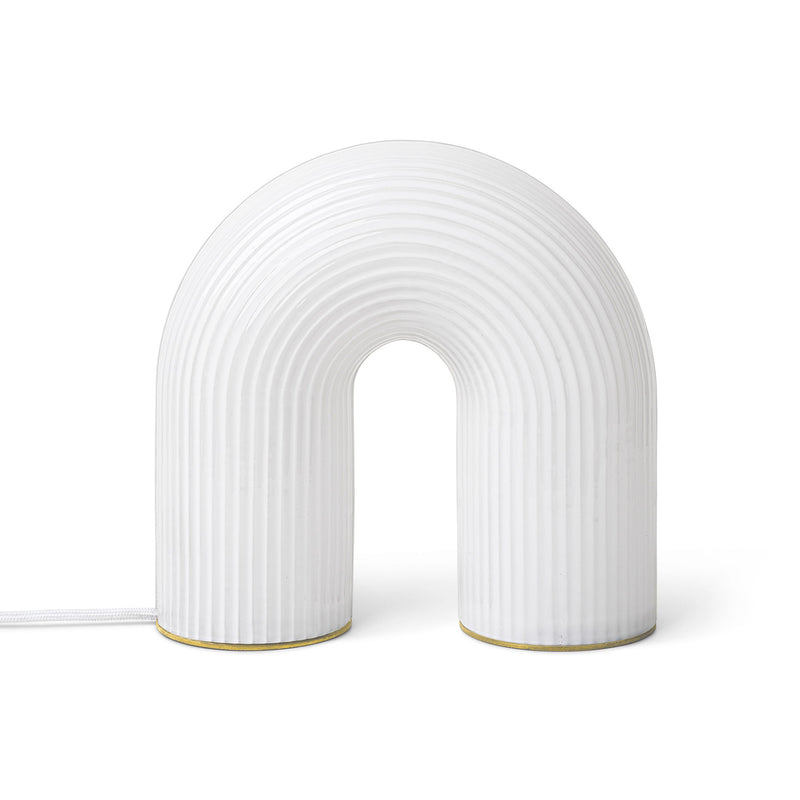 The Vuelta Lamp by Ferm Living elevates the simplicity of sculptural design with a form that captures pure geometric purity. Inspired by classic architectural arches, its curved silhouette of fluted opal glass not only defines the space but also softens the light, projecting a warm, enveloping glow that enriches any environment.