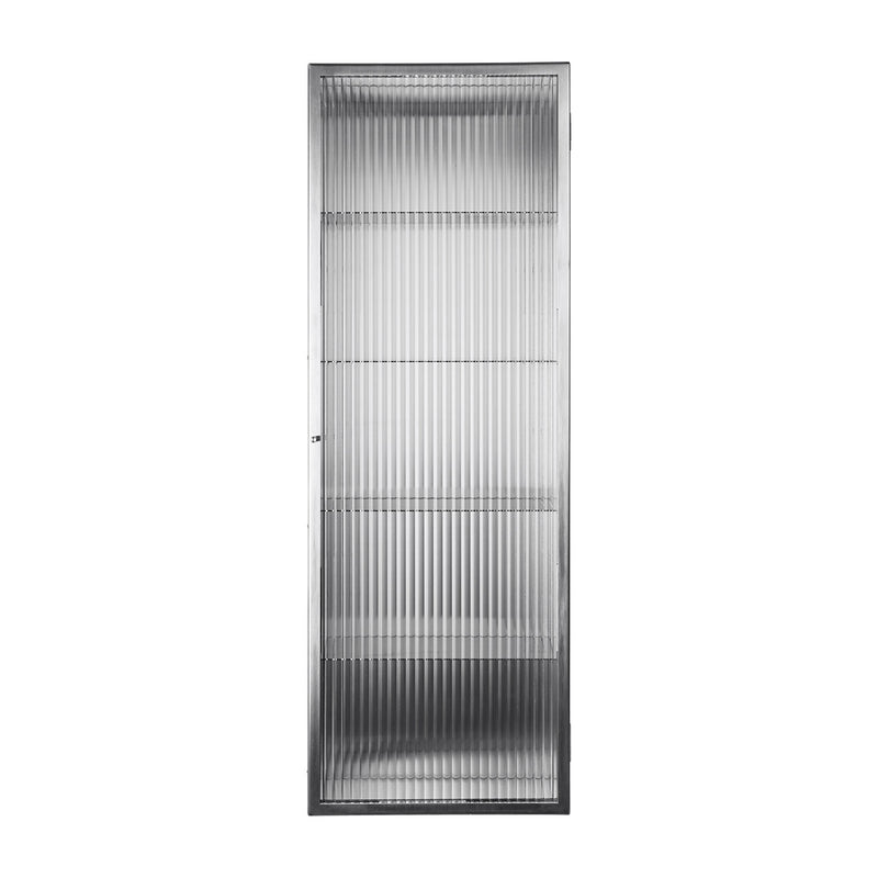 La vitrina de pared alta Haze de Ferm Living amplía la elegancia industrial de la colección con un formato vertical que multiplica la capacidad de almacenaje sin ocupar espacio en el suelo. Su estructura de acero con recubrimiento en polvo negro se combina con paneles de vidrio corrugado, creando un juego visual de transparencia y textura que aporta ligereza al diseño.