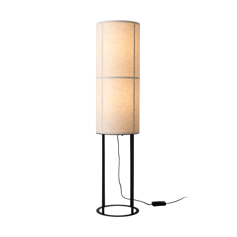 Filling the space with diffused light, the Hashira floor lamp by Norm Architects is characterized by the texture of its tall shade and its slender, graphic structure. The elegant powder-coated steel base lends a lightweight expression to the design. Its black metal surface creates a contrast with the linen shade, which acts as a diffuser, projecting light in all directions while creating a cozy, glare-free atmosphere. It is dimmable. Adding warmth to the room, both acoustically and tactilely, the shade delicately reveals its internal structure. As a functional light source in a living room, dining room, hallway, or bedroom, this floor lamp offers a sense of understated luxury and calm to any interior space.