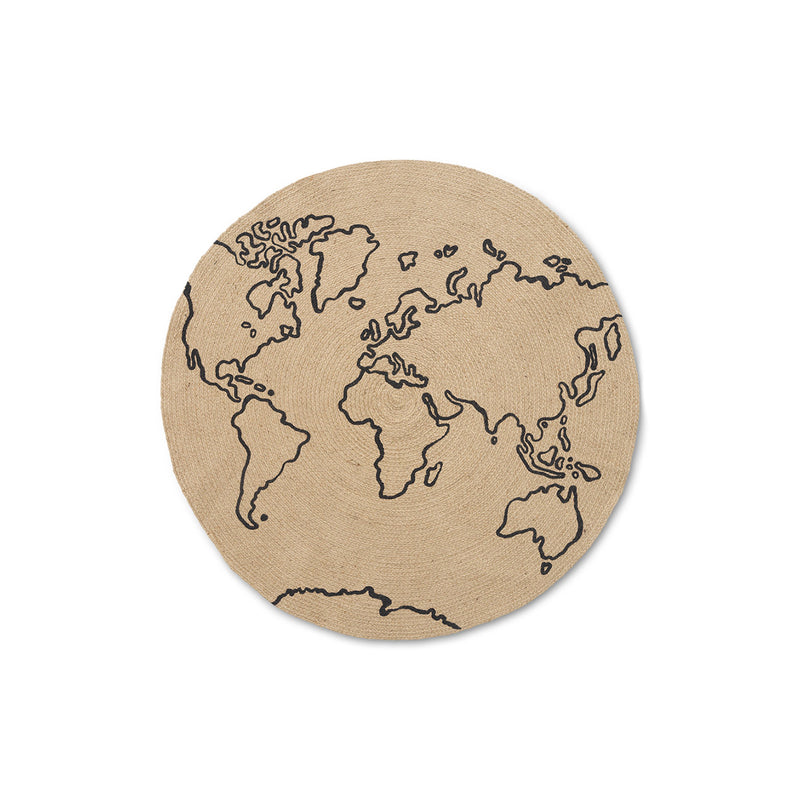 La alfombra infantil Jute de Ferm Living transforma cualquier habitación en un entorno lúdico, acogedor y con estilo. Tejida en yute 100% natural, esta alfombra circular está disponible en tres versiones decorativas —mapa del mundo, lunares negros o triángulos gráficos— que invitan al juego, a la imaginación y al descubrimiento desde el suelo.