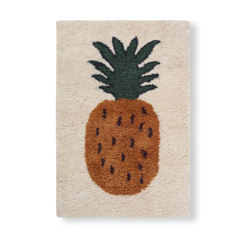 Confeccionadas con lana de Nueva Zelanda y técnica de tufting, ambas alfombras ofrecen un acabado grueso y un pelo alto que invita a tumbarse, andar descalzo o improvisar aventuras junto al mar. Ya sea la silueta vibrante de una piña o la forma dulce de una fresa, cada modelo aporta color, textura y una presencia cálida que acompaña el crecimiento con estilo.