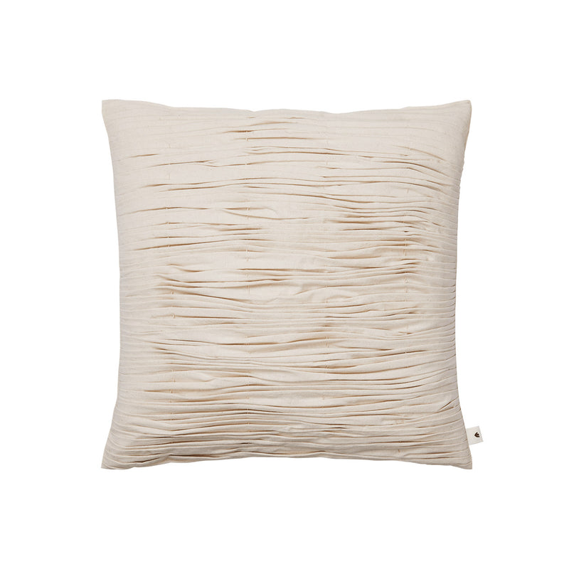 Confeccionado en algodón orgánico sin teñir y certificado GOTS, este cojín presenta un diseño smocked que se logra mediante un delicado proceso manual: el tejido se frunce en pequeños pliegues que se fijan con costuras decorativas, generando un juego sutil de relieve y movimiento.