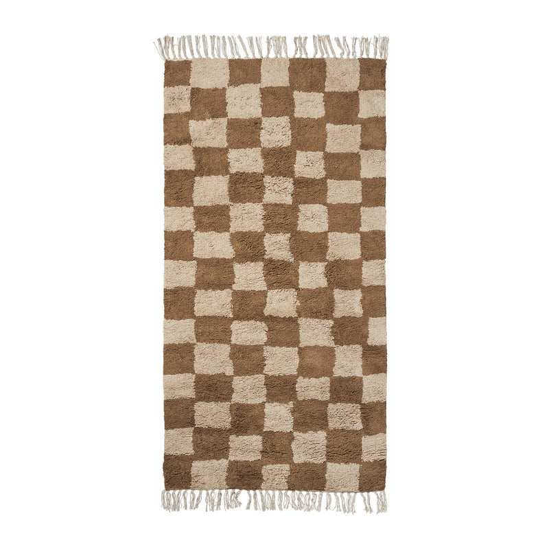 La alfombra Mara de Ferm Living actualiza la tradición de las alfombras de lana con un diseño gráfico y audaz, ideal para interiores que buscan originalidad y textura. Su patrón de cuadros a gran escala y los flecos decorativos en los extremos crean un efecto visual llamativo sin perder equilibrio ni sofisticación.