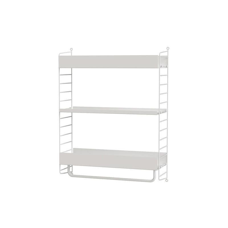 A combination of shelving with floor panels, shelves, metal shelves with high and low edges, and a media library shelf. This String shelf is ideal for a kitchen or living room, depending on its use. In the kitchen, it will house all your kitchen appliances, while in the living room, it will serve as a place for books and a music player.