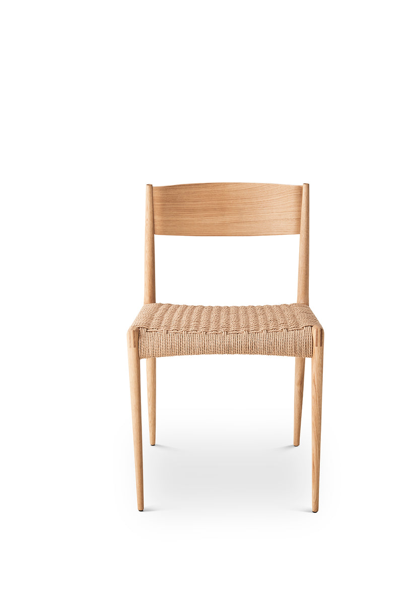 The slender, tapered solid wood legs provide a very light visual expression, further emphasized by two precise details: the hand-sanded rounded finish on the top of the rear legs, and the finger-joint of the front legs. The seat is made of hand-woven paper rope, and the backrest is molded, providing optimal seating comfort. Hand-weaving the seat alone takes two hours, making the chair a time-consuming process that requires patience and great precision.