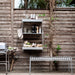 This two-section suspended combination is designed for outdoor use. Featuring galvanized panels and shelves, the surface changes over time, leaving a beautiful patina. A combination of high- and low-edged shelves adds character to the piece.