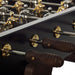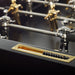 Su estructura en acero con tratamiento de cataforesis, los jugadores cromados en oro y plata y los accesorios bañados en oro de 24k —como cuentagoles, cojinetes y tornillos— realzan el carácter refinado de la pieza. Las patas de madera de iroko oscurecida, que mantienen la textura natural de la veta, aportan calidez y equilibrio visual al conjunto, reforzando su personalidad sofisticada y contemporánea.