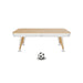 Estructura y patas de acero con pintura de poliéster microtexturada y detalles en madera de iroko. Superficie de fibrocemento monobloque de 20 mm. Tapete Gorina (90 % lana, 10 % nailon). Bandas con goma K66 premium. |