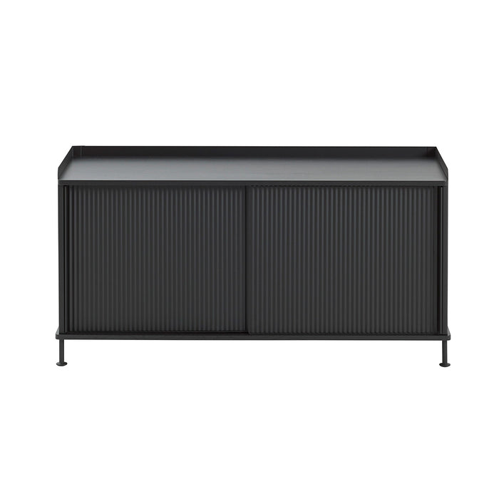 El Aparador Enfold Bajo de Muuto ofrece una interpretación contemporánea del almacenamiento, fusionando la materialidad industrial del acero lacado con la calidez del roble macizo. Sus puertas acanaladas envuelven cuidadosamente el tablero de roble superior e inferior, generando un contraste elegante que define su carácter único.