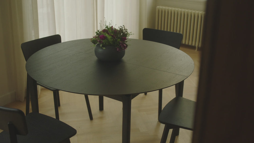 Fabricada en roble macizo, esta mesa incorpora un sistema de extensión alojado internamente, que permite ampliar la superficie con facilidad cuando se necesita recibir a más comensales. De este modo, una mesa redonda pensada para cuatro personas se adapta cómodamente a encuentros más amplios, manteniendo siempre la armonía del conjunto.